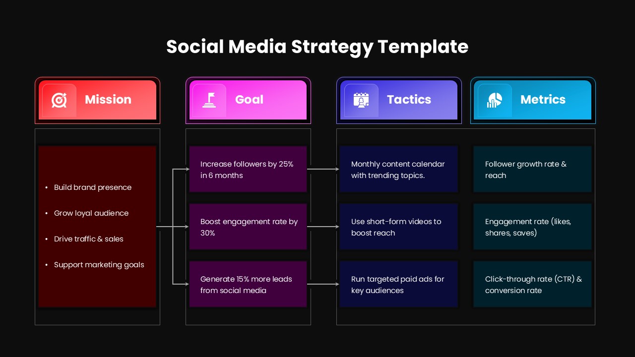 The slide is divided into four main sections—Mission, Goal, Tactics, and Metrics—each visually separated with bold color blocks. The Mission column lists foundational priorities such as building brand presence and driving traffic. The Goal area presents three defined targets, including follower growth, engagement improvement, and lead generation. The Tactics section outlines actionable steps like content calendars, short-form video strategies, and targeted ads. Finally, the Metrics panel highlights how success will be measured using growth rates, engagement indicators, CTR, and conversion data.