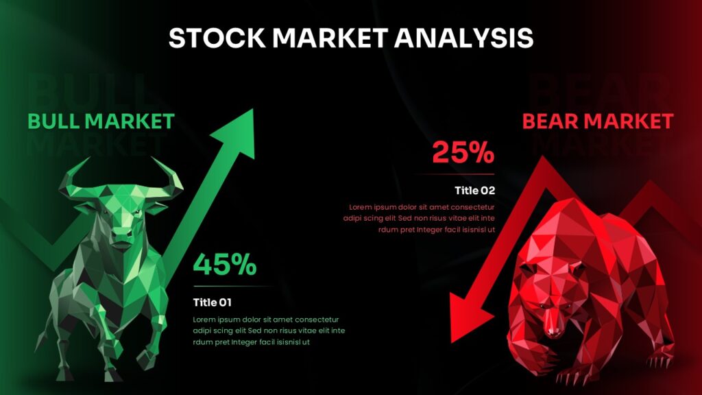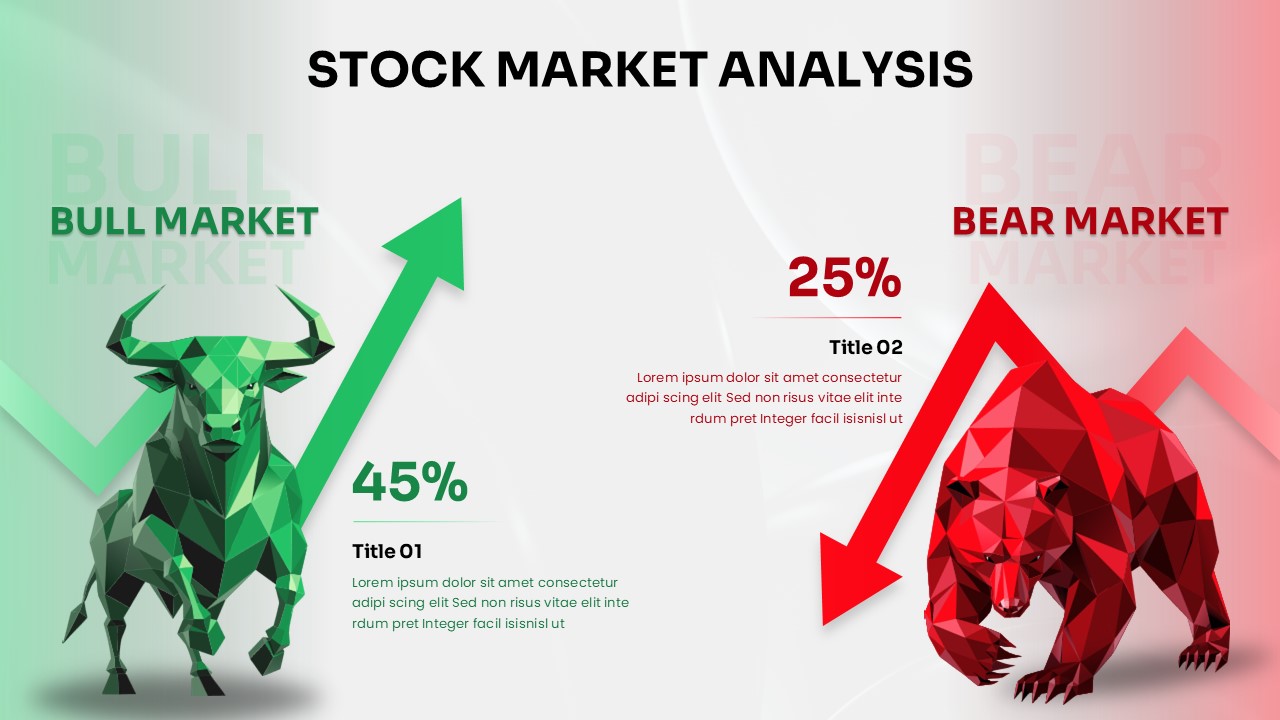 Transform your financial presentations with this professional Stock Market Analysis template featuring striking bull and bear market comparisons. This template combines geometric visual design with data-driven insights, perfect for presenting market trends, investment analysis, and financial performance metrics. The dramatic contrast between bullish and bearish market conditions helps audiences quickly understand market dynamics through both visual metaphors and statistical data.
