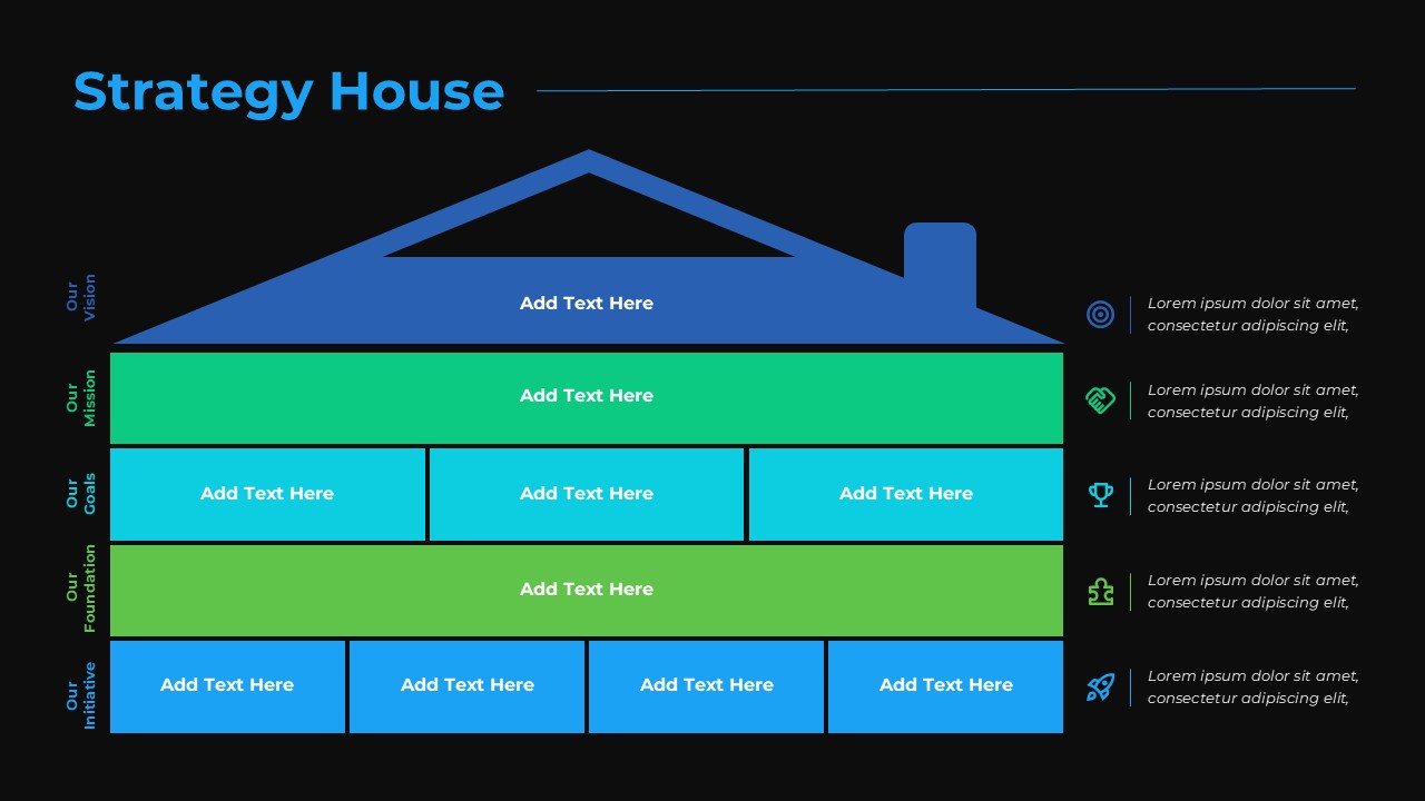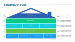 Each tier of the house is color coded to distinguish strategic levels, while editable placeholder text helps users adapt the diagram to their own planning frameworks.