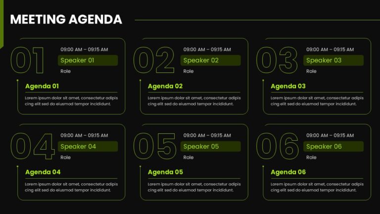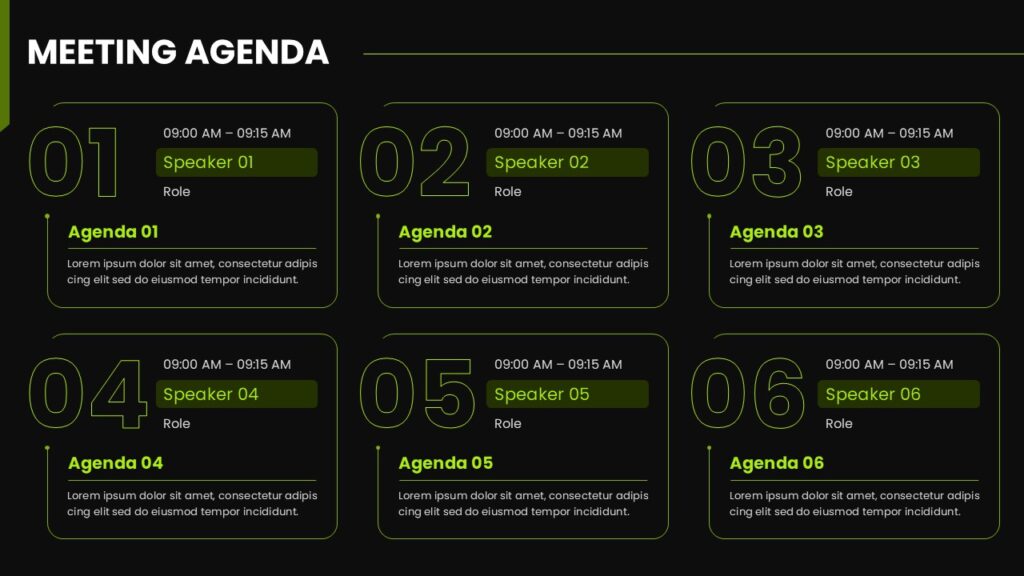 The template includes a multi block agenda slide divided into six clearly numbered sections. Each section provides space for time slots, speaker names, roles, agenda titles, and short descriptions. The layout uses rounded containers and subtle color accents to separate agenda items while maintaining a cohesive structure. The design allows users to add or remove agenda blocks depending on meeting length and complexity.