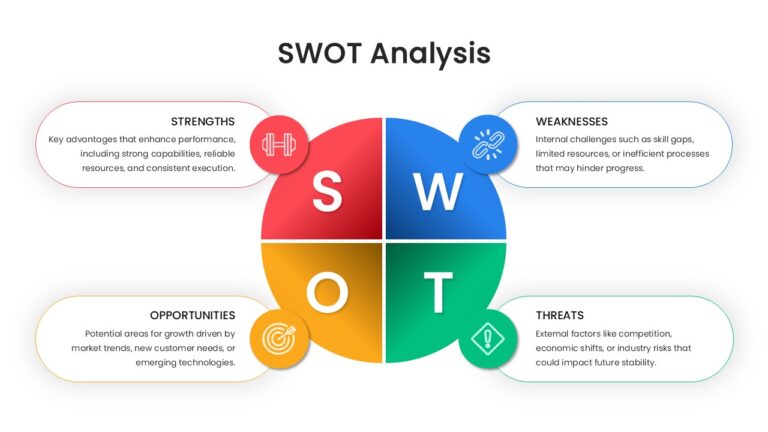 The slide features a four-quadrant matrix at the center, each section dedicated to one SWOT component. Surrounding the matrix, individual text containers summarize key points for each category strengths, weaknesses, opportunities, and threats. Each quadrant is paired with a relevant icon to further enhance comprehension, making the template visually intuitive for stakeholders and audiences across organizational functions.