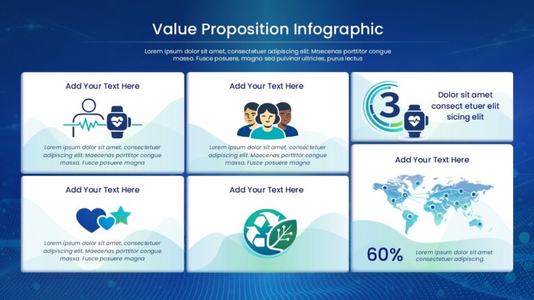 The template includes multiple infographic-style slides arranged in a clean grid layout. Each slide section is designed to highlight a specific value point such as customer benefits, audience segments, performance indicators, sustainability focus, and geographic presence. Visual placeholders support icons, illustrations, percentages, and short descriptions, allowing presenters to replace content without redesigning the structure. The composition is balanced to support both text and visuals while keeping slides easy to scan.