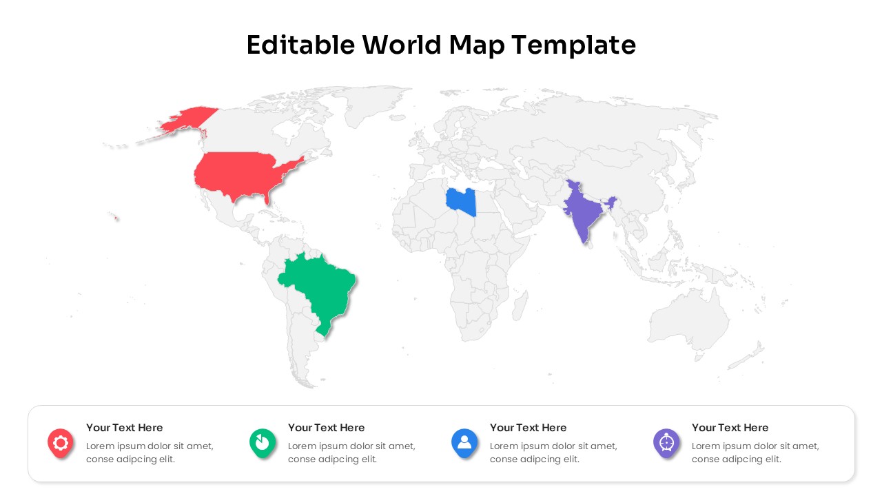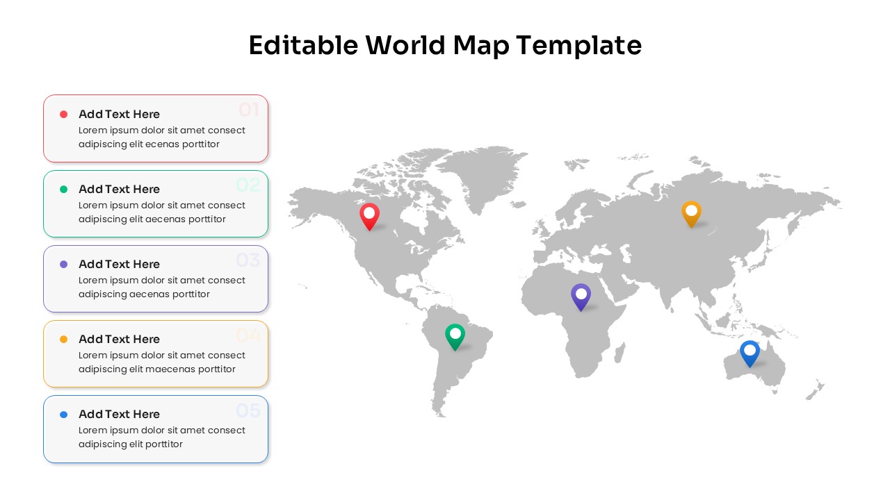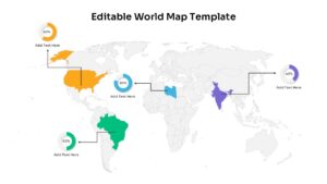 Across five expertly designed slides, the template provides multiple world map variations—ranging from fully colored maps to muted grayscale versions with accent markers. These layouts support region-specific callouts, data points, and customizable labels for presenting geographic insights. Each slide features editable vector shapes, ensuring seamless color updates and the ability to isolate continents or countries as needed. The template also includes pin markers, highlight zones, and space for explanatory text to support structured storytelling.