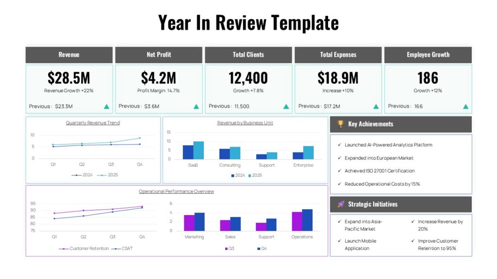 This template serves executives, business leaders, and analysts who need to present comprehensive annual performance reviews to stakeholders, board members, or internal teams. It’s particularly valuable for companies conducting year-end assessments, strategic planning sessions, and investor presentations. The design works excellently for consulting professionals preparing client reports, HR departments showcasing organizational growth, and management teams communicating achievements and future initiatives to various audiences.