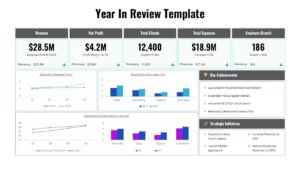 This comprehensive Year in Review template delivers a professional dashboard-style presentation that showcases your organization’s annual performance through compelling data visualizations and key metrics. The template features both light and dark theme variants, making it completely editable in Microsoft PowerPoint & Google Slides to match your brand preferences. Perfect for executive reporting, stakeholder communications, and annual business reviews, this template transforms complex business data into clear, actionable insights that demonstrate growth, achievements, and strategic direction.