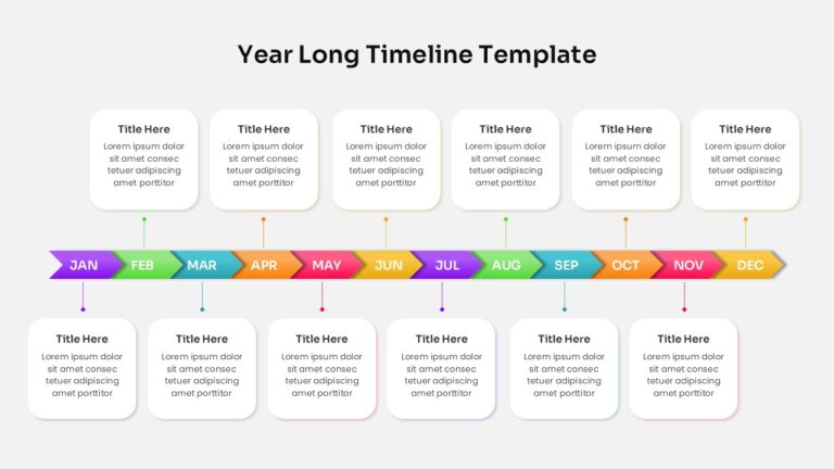 The template includes a single comprehensive timeline slide covering all twelve months of the year. Each month is represented by a color coded arrow segment placed along a central horizontal line. Above and below the timeline, rounded content cards allow space for titles and short descriptions. These text areas can be customized to reflect goals, tasks, events, or milestones for each month.